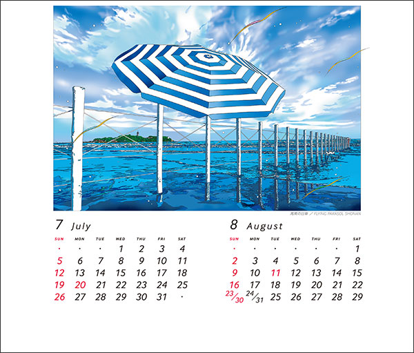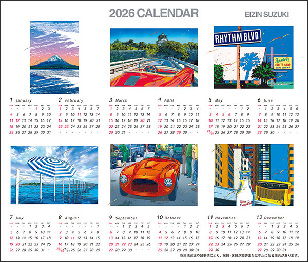 2026年版卓上カレンダー 1,300円(税別) TYPE: カレンダー YEAR: 2026 SIZE: 12.5×14.8cm 透明プラスチックケース入り 【卓上カレンダー】全8枚 ※表紙・一覧含む 【鈴木英人カレンダー】 2026年版卓上カレンダー END OF SUMMER DAYS 夏の終わりのサンセバスチャン